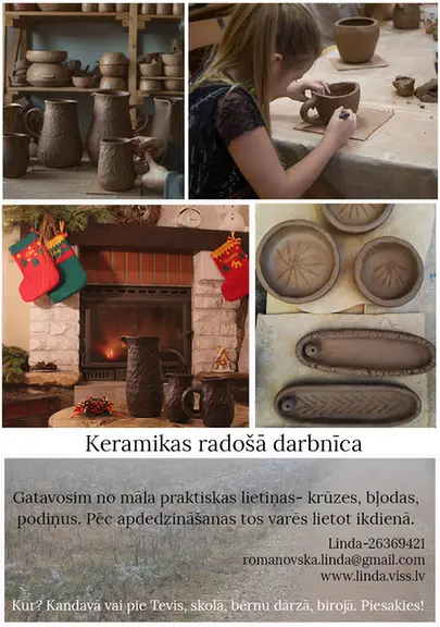Aicinu uz mierpilnu un iedvesmojošu keramikas darbnīcu, kurā darbosimies ar Latvijas brūno mālu — dabisks, mīksts, plastisks un dziedinošs materiāls.